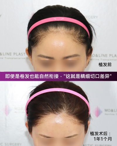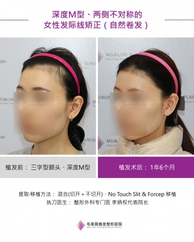 深度M型、两侧不对称的女性发际线矫正(自然卷发)