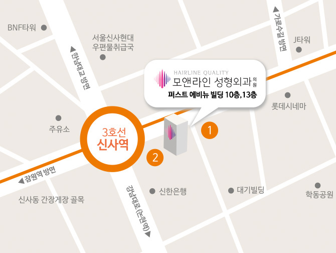 • 신사사거리에서 하차 후 신사역 2번 출구로 나오시면 우측에 병원건물이 보입니다.