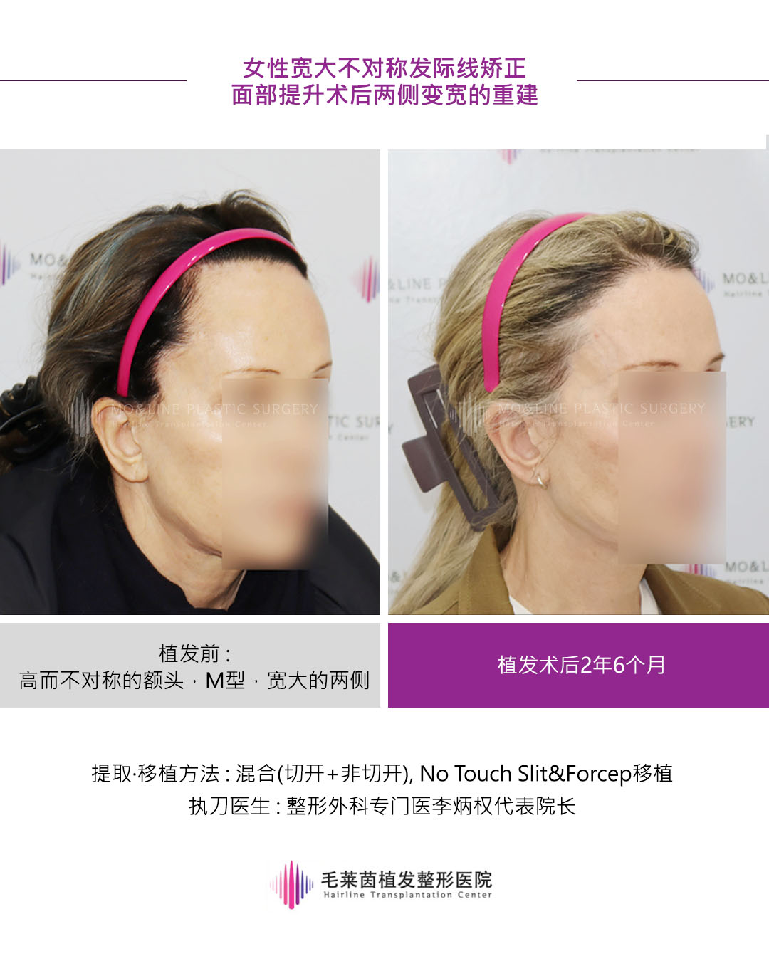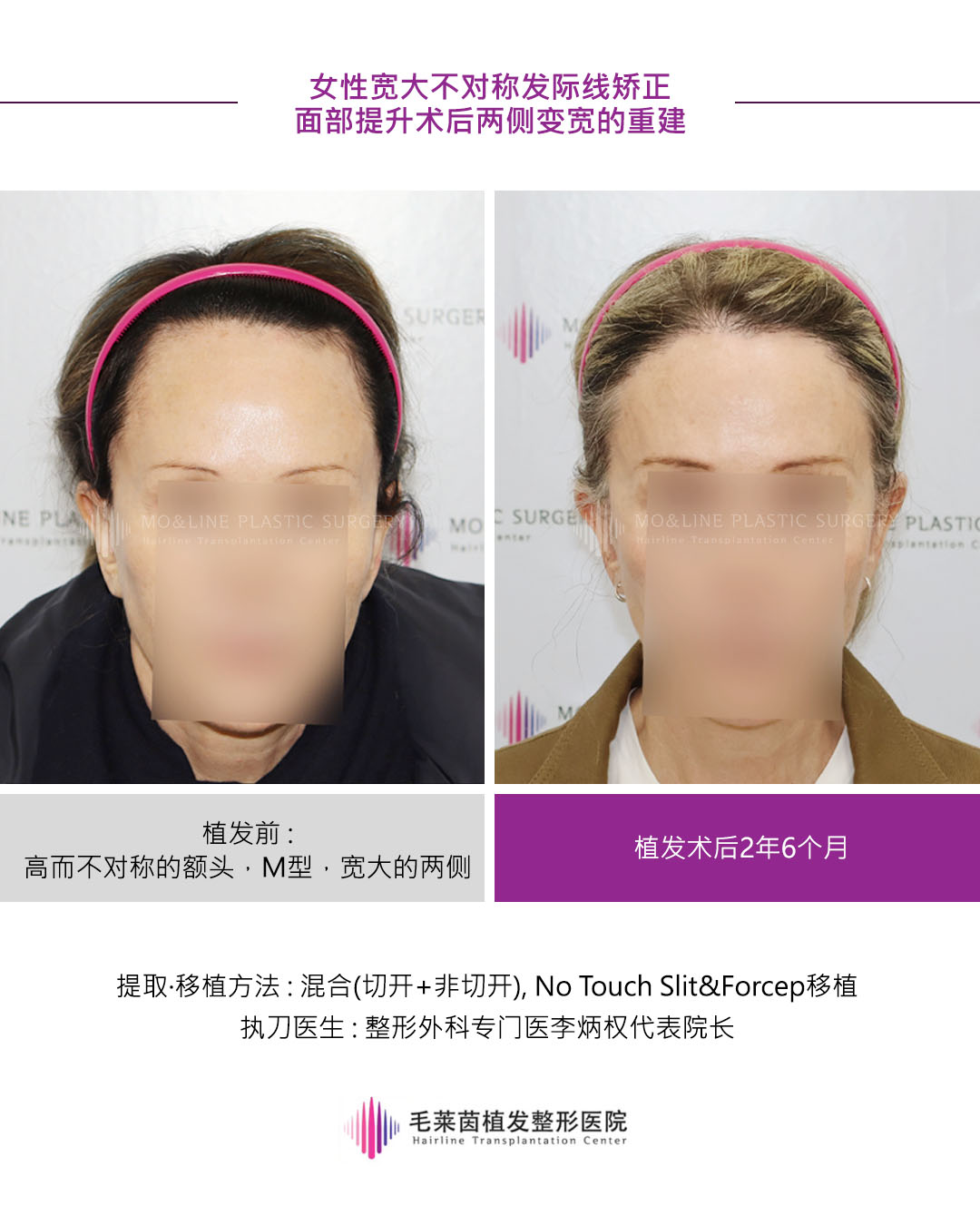 这是一位来自纽约的女性患者的真实经历。她曾因额头较高、发际线偏方正,以及此前接受面部提升术后导致的侧脸区域显宽等问题而感到困扰。经过在毛莱茵植发整形医院进行的发际线调整手术后,她成功获得了更显柔美、小巧的脸型轮廓,并对手术效果非常满意。