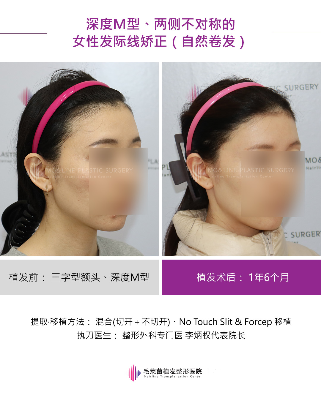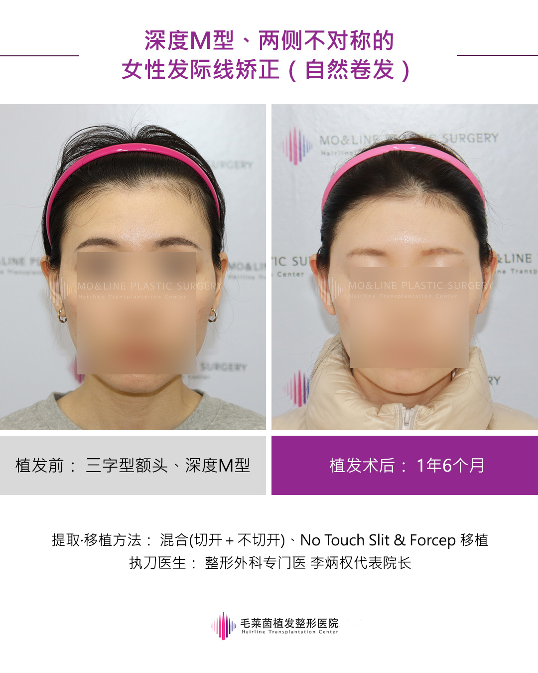 深度M型、两侧不对称的女性发际线矫正(自然卷发)