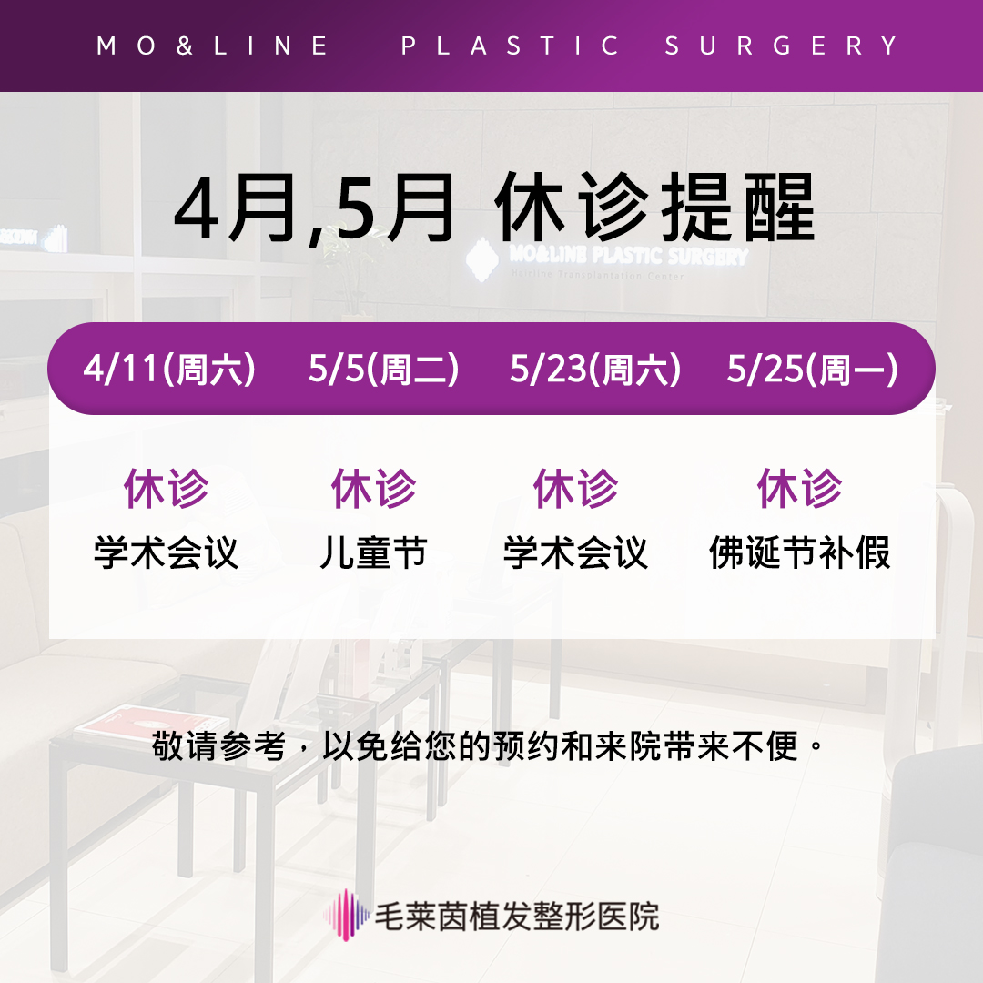 [ 2026年 4月、5月 休诊通知 ]- 4月11日(周六):学术会议|休诊- 5月5日(周二):儿童节|休诊- 5月23日(周六):学术会议|休诊- 5月25日(周一):佛诞日补假|休诊这里是位于新沙站的毛莱茵植发整形医院,专注于发际线矫正、植发及脱发治疗。来院前请务必确认诊疗日程,以免影响预约及就诊。:)