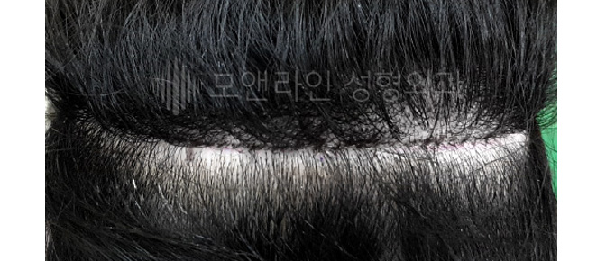 넓게 생긴 흉터 축소 및 헤어라인 재교정을 위해 이병권 원장이 절개 재수술을 진행한 경우.