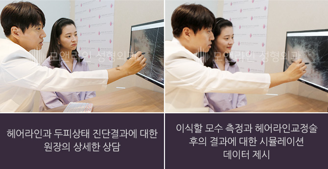 헤어라인과 두피상태 진단결과에 대한 원장의 상세한 상담 / 이식할 모수 측정과 헤어라인교정술 후의 결과에 대한 시뮬레이션